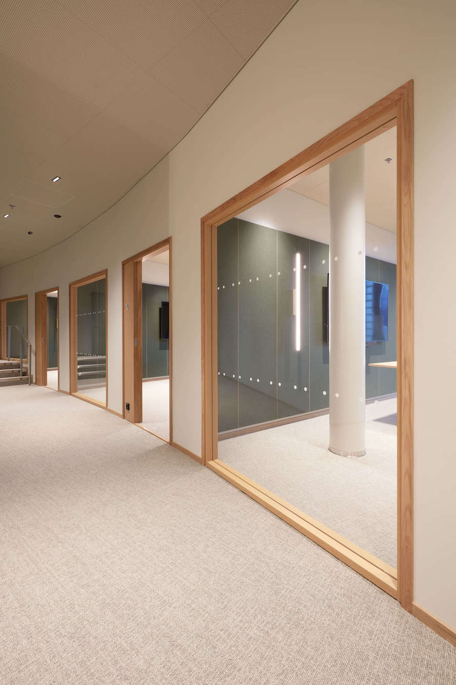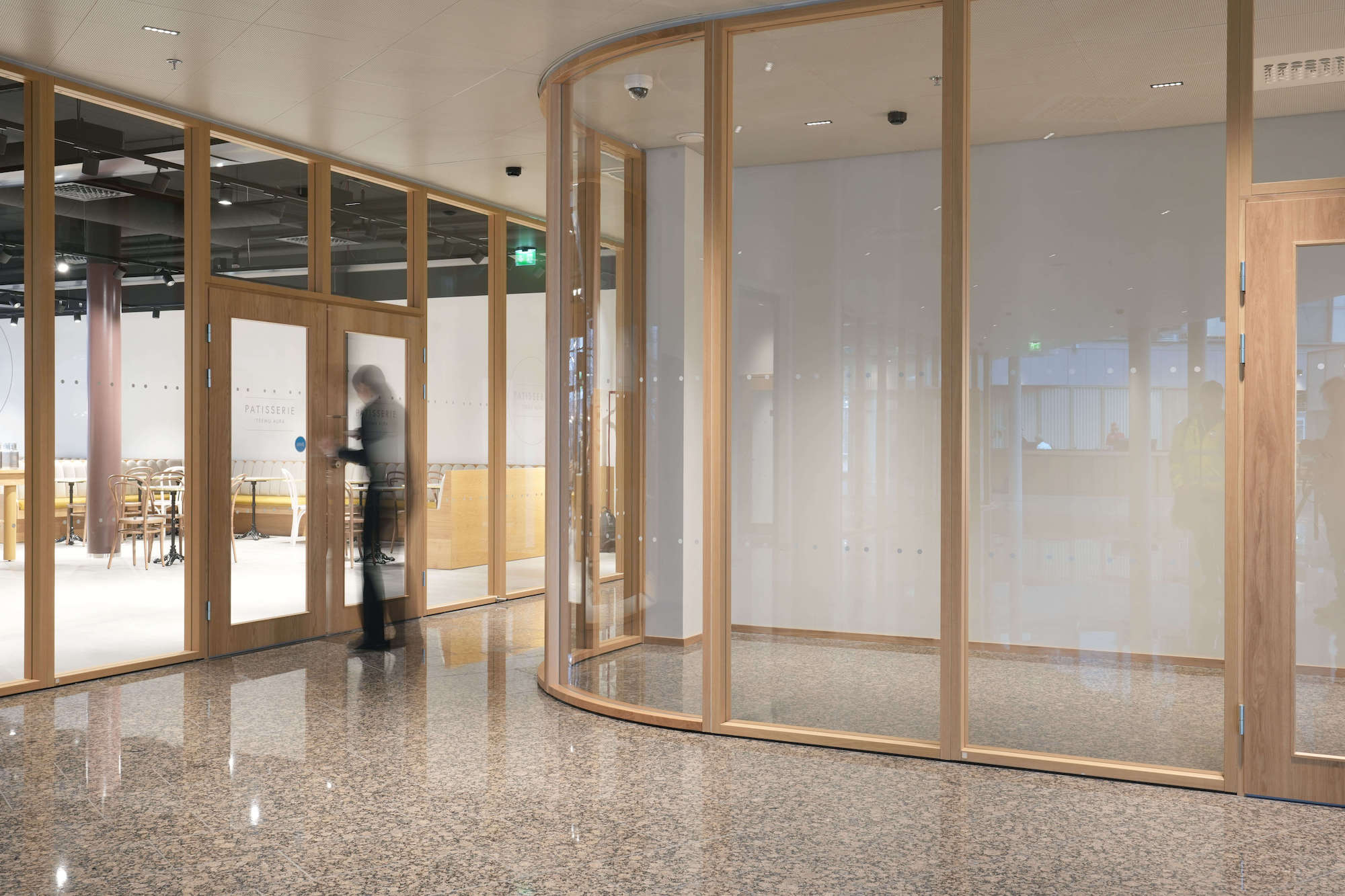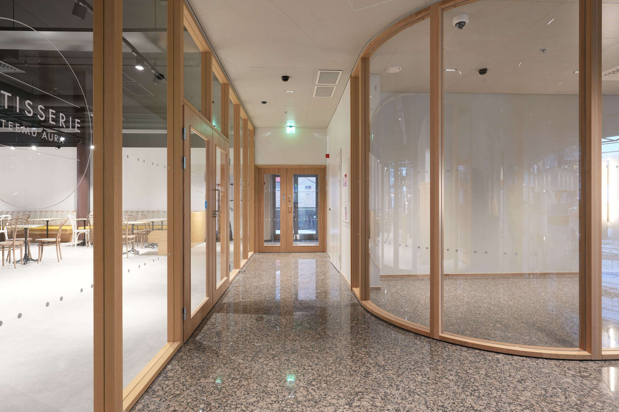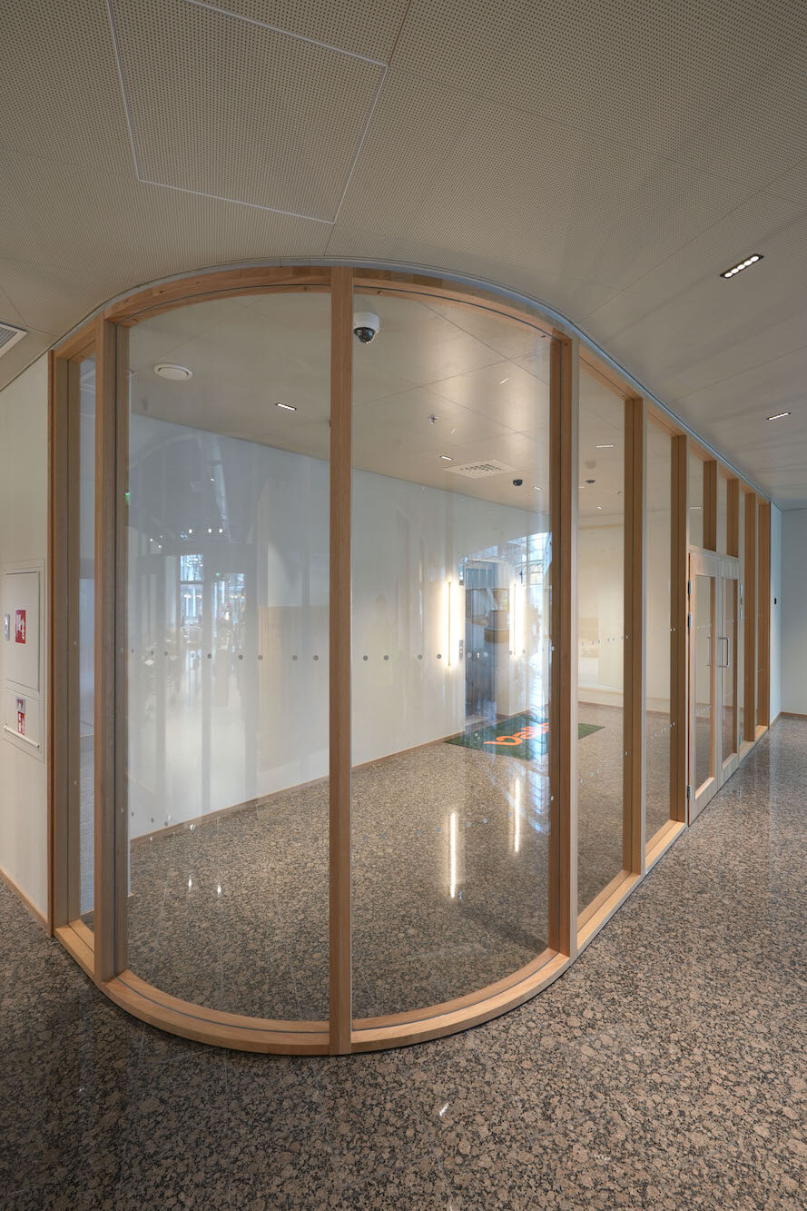 Osa lasiseinistä toteutettiin myös hieman erikoisemmilla, kaarevilla puitteilla ja lasipinnoilla. Nämä taitavan puun ja lasin käsittelyn yhteistyönä syntyneet kaarevat seinäelementit ovat näyttävä yksityiskohta, joka kiinnittää varmasti tilojen käyttäjien huomion.