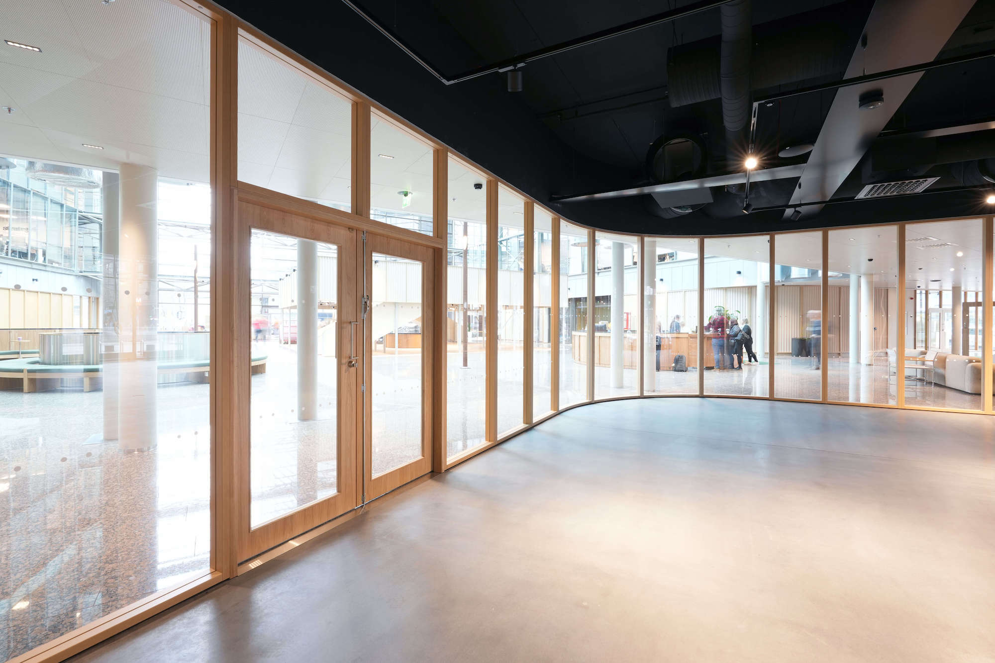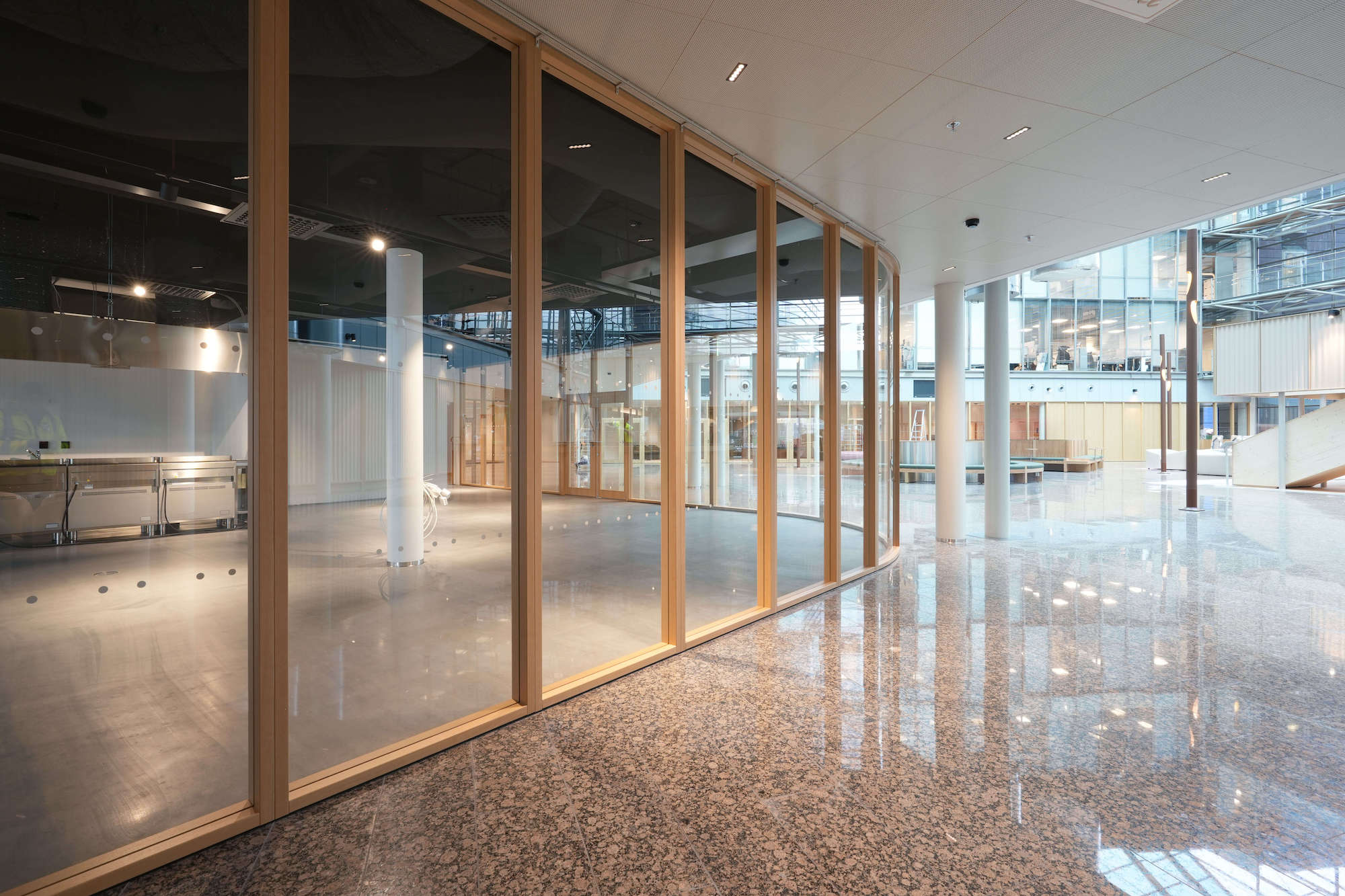 Lasiseinillä toteutettiin atriumiin rajautuviin tiloihin pitkiä seinälinjoja. Korkeat lasiseinät ja niiden yhteyteen toimitetut suurilla lasiaukoilla varustetut ovet muodostavat ajattoman tyylikkään kokonaisuuden. Laajojen lasipintojen ansiosta Atriumin luonnonvalo pääsee esteettä siirtymään viereisiin tiloihin ja tilat tuntuvat avarilta. Osaan Atriumiin rajautuvista tiloista seinäelementit toteutettiin umpielementteinä siten, että seinän pintamateriaalina on mikroperforoitu tammiviilutettu kuitukipsilevy.