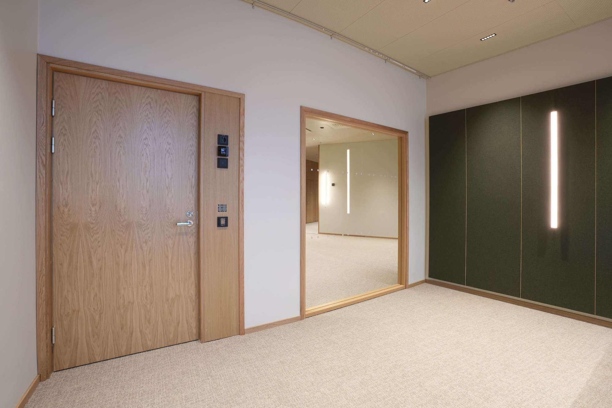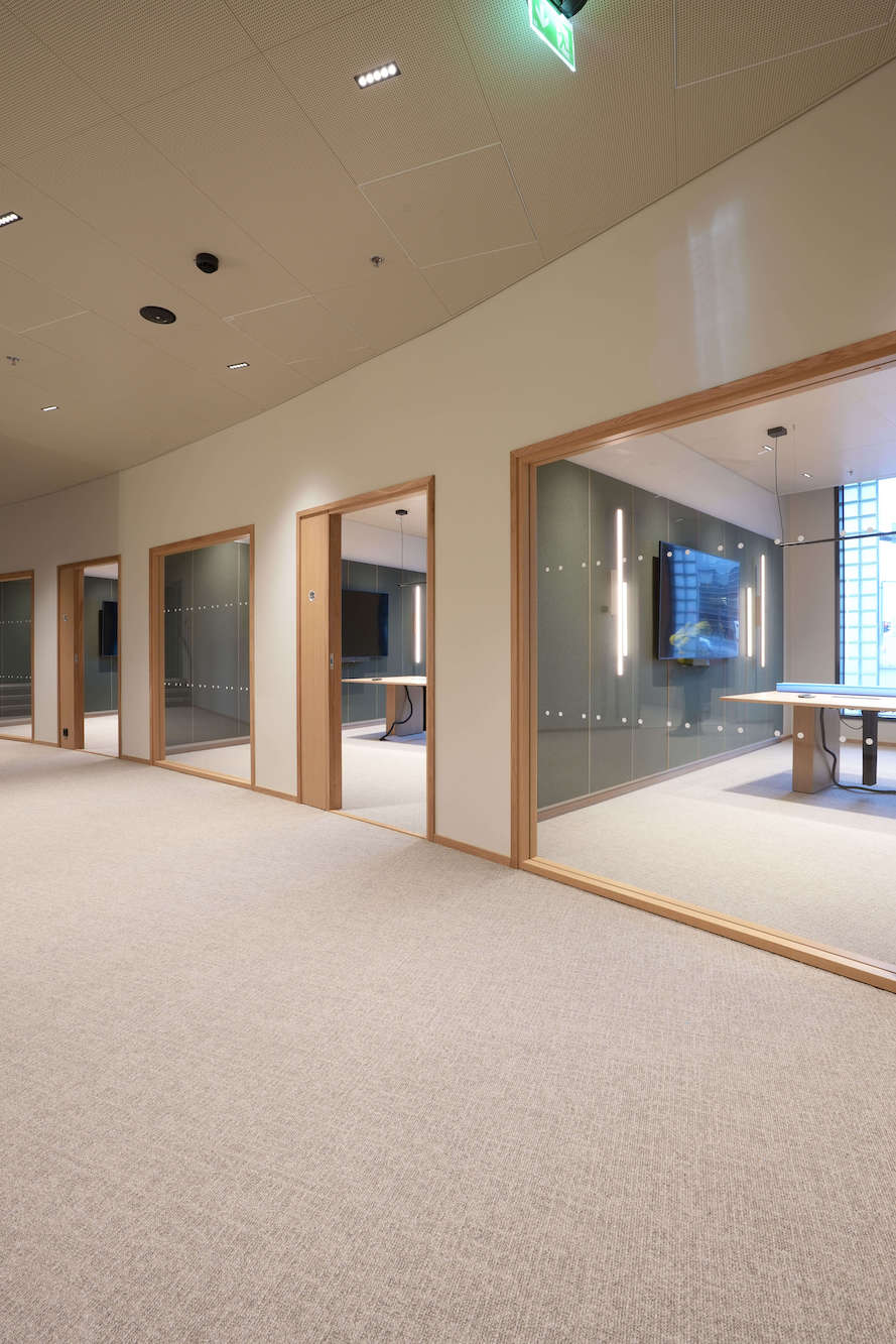 Puulasiseiniä hyödynnettiin myös kokouskeskuksen yksittäisten tilojen toteutuksessa. Jotta lasiseinillä muodostettujen tilojen käytettävyys on mahdollisimman hyvä, on kaikki kohteeseen toimitetut seinät tehokkaasti ääntä eristäviä (Rw41dB). Yhdessä ääntä eristävien ovien kanssa ne takaavat tilojen käyttäjille häiriöttömän ympäristön, ja tiloissa käytävien keskustelujen yksityisyyden.