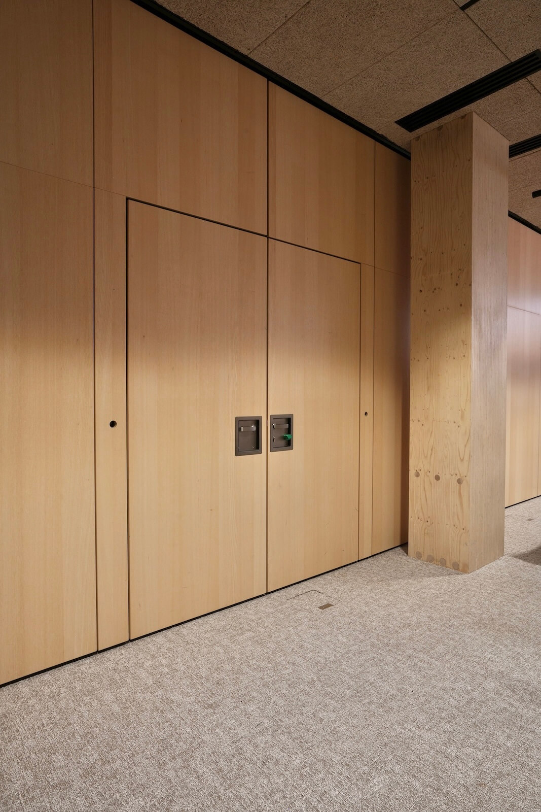 Puurakenteisessa kohteessa luonteva valinta ovien pintamateriaaliksi oli saarniviilupinta. Se sopii tyylikkäästi yhteen kohteen muiden rakenteiden kanssa ja antaa seinille ajattoman sekä arvokkaan ilmeen. Siirtoseinät on varustettu saarniviilupintaisilla pariovilla.