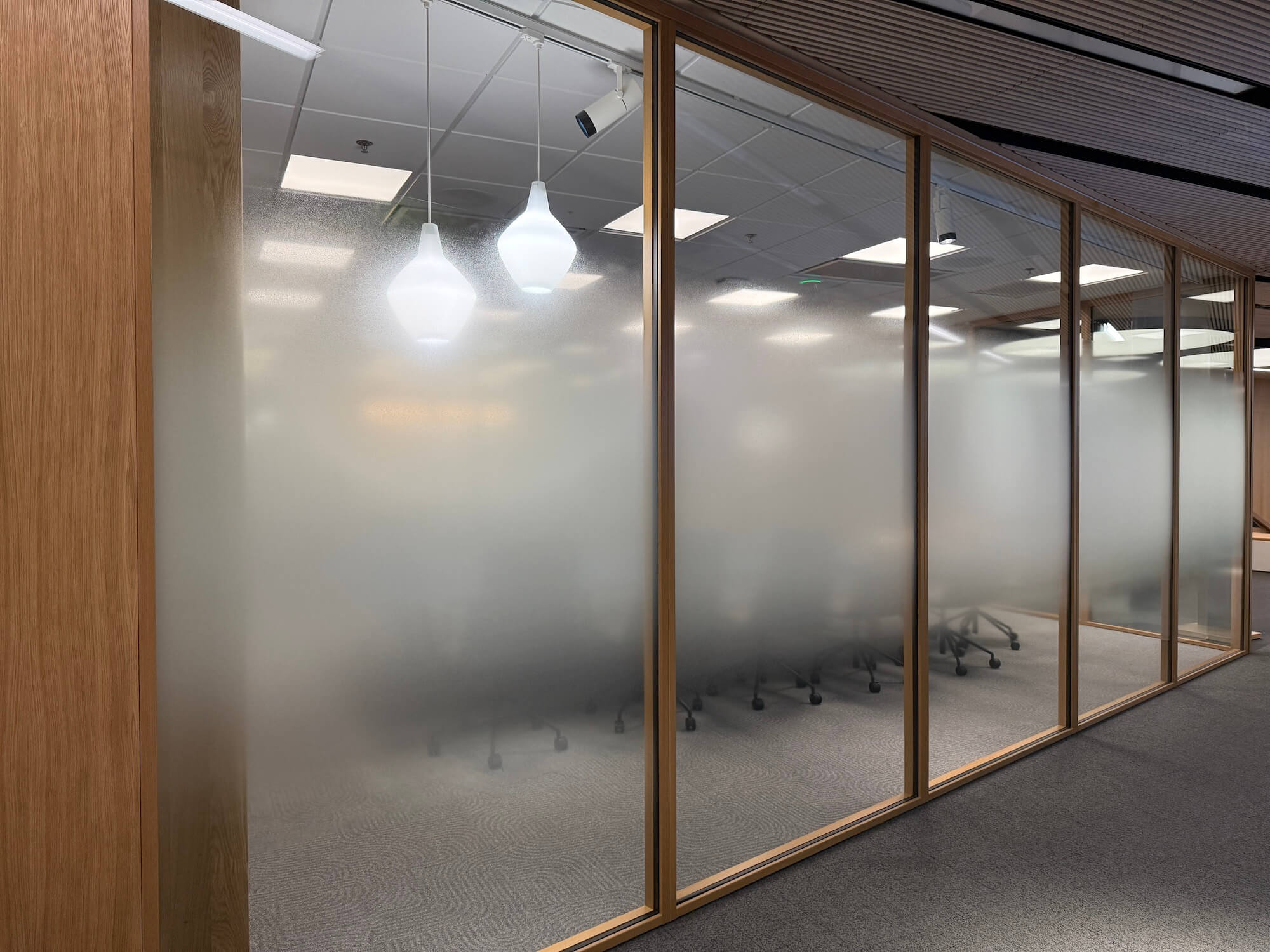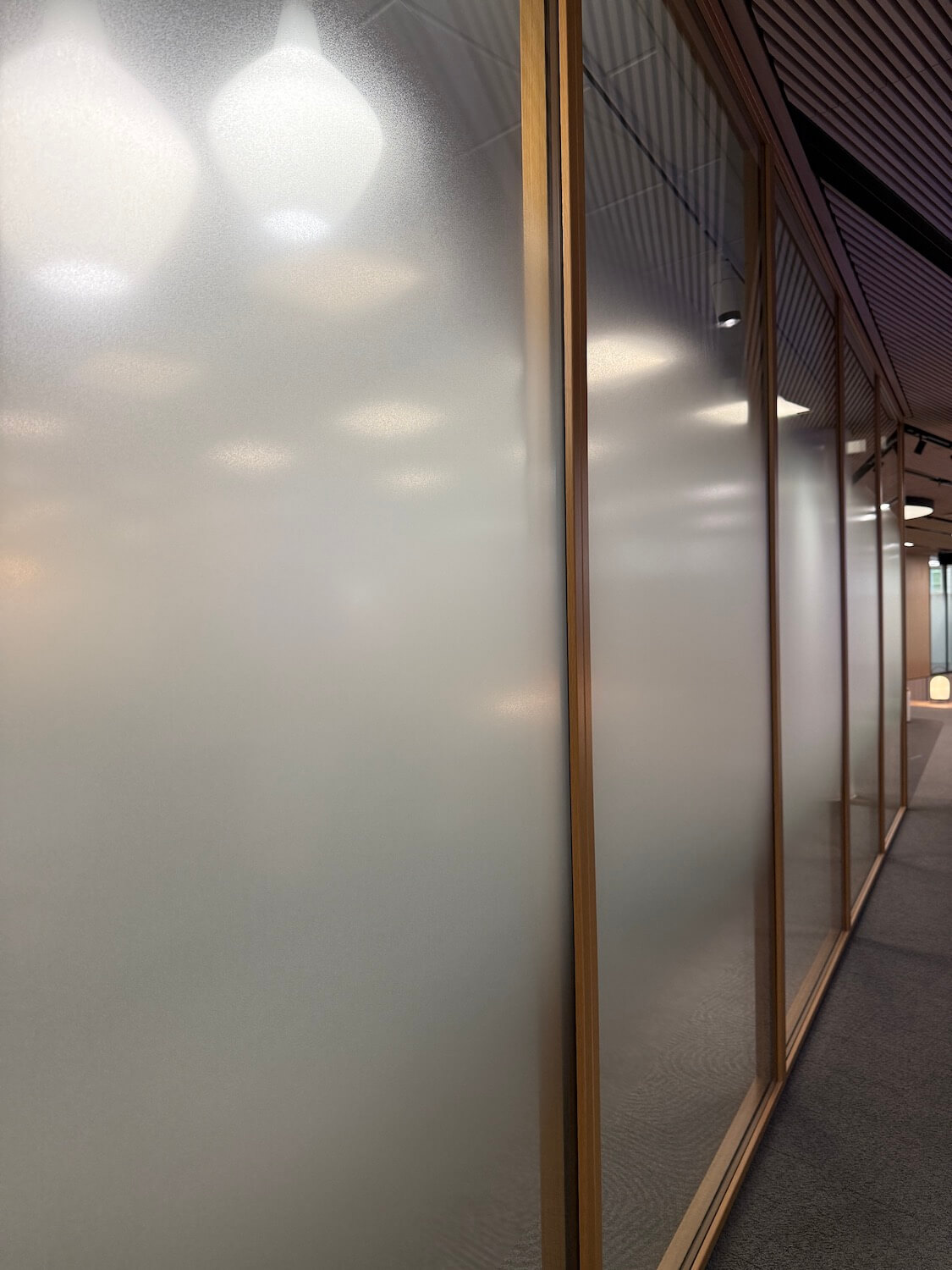 Lasiseinien yhteyteen toimitettiin myös yhteensopivalla tammiviilupinnalla viimeistellyt seinien umpiosat ja ovien sähköpielet tilakohtaisen tekniikan hallintaa varten. Näyttävä kokonaisuus viimeisteltiin laadukkailla tammiovilla.